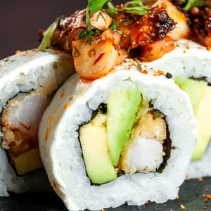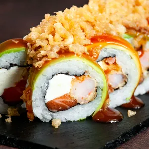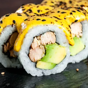 Avocado Nori: Pollo teriyaki, Queso Crema, Cebollin. Cubierto en Palta con trozos de Camaron Apanado, bañado en salsa de la casa